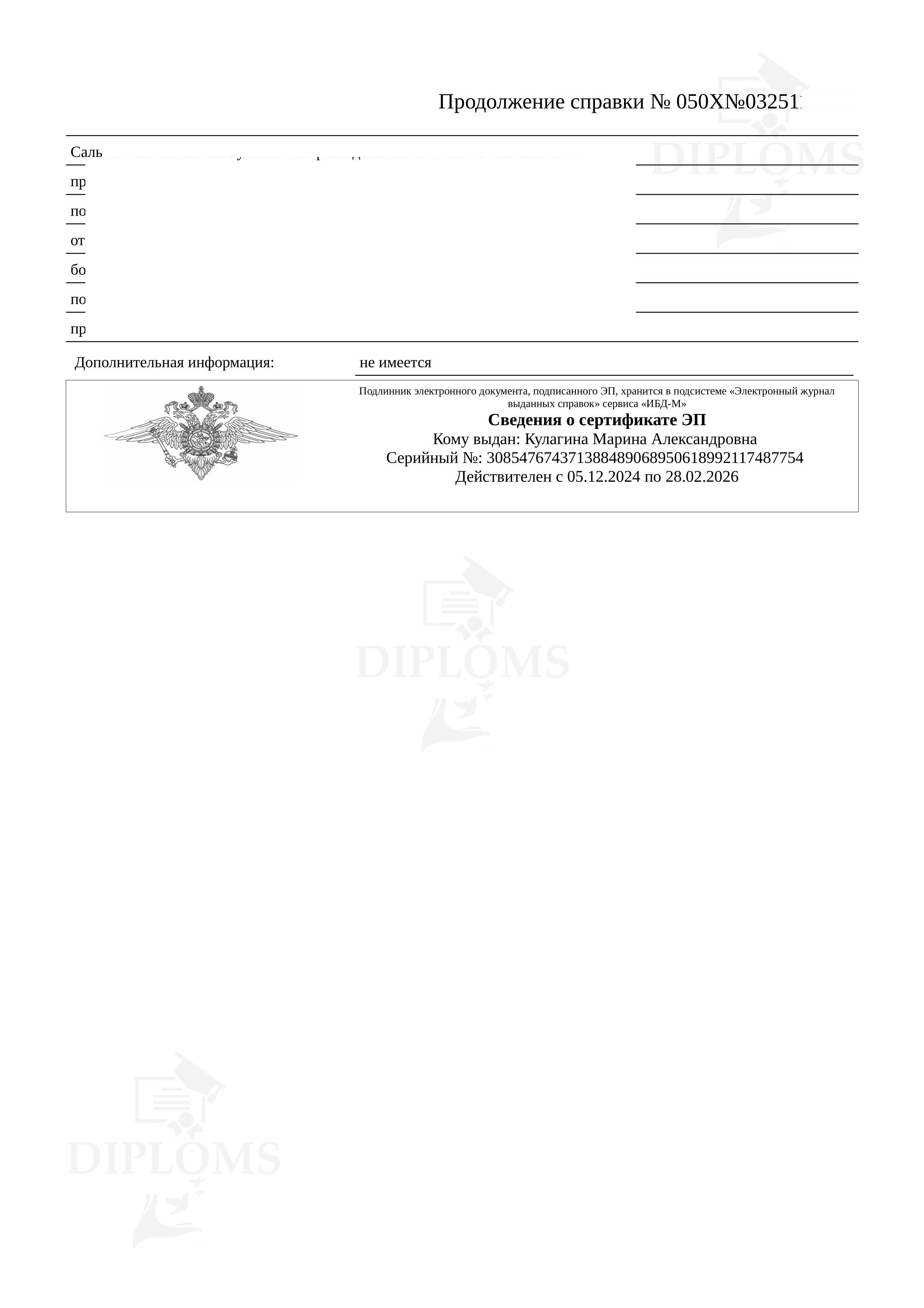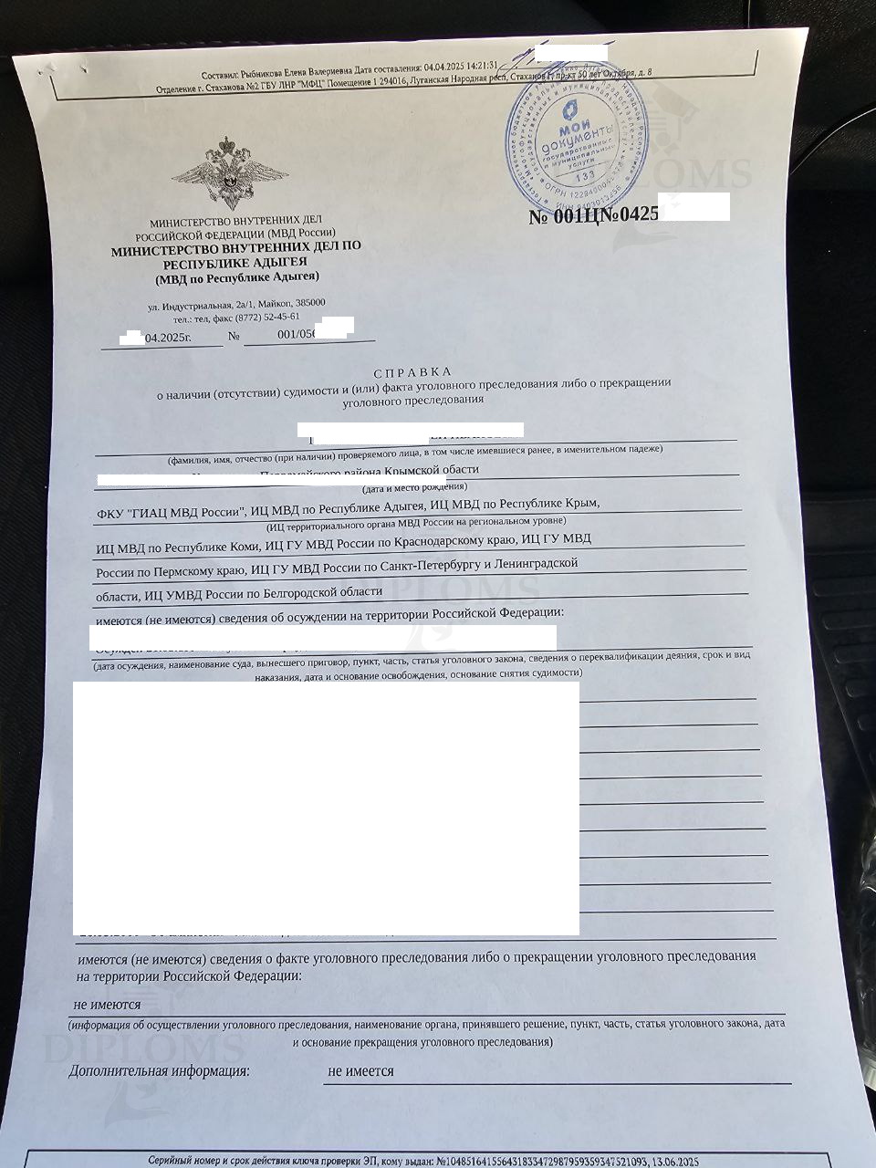 На что обратить внимание при покупке справки о несудимости? Очень многие организации делают справки только от определённых (популярных) регионов. Мы можем сделать справку о несудимости из любого региона/информационного центра. У нас есть образцы всех областей, республик, краев Российской Федерации. Эта база нарабатывалась годами. Также у нас самая большая база апостилей из всех регионов. Образцы справок о несудимости Из МВД (регионального информационного центра) Из МФЦ С портала Госуслуг С апостилем Апостиль нужен для предъявления документа за границами Российской Федерации. Мы делаем справки о несудимости от любых учреждений (МФЦ, МВД, с Госуслуг) и от любого региона Российской Федерации. От каких учреждений можно сделать справку о несудимости? Компания «Diploms» делает справки от МФЦ и от МВД. Также мы можем сделать электронный вариант, если вы заказываете справку в Интернете через портал Госуслуг. Это специальный PDF-файл, идентичный тому, что вы получаете через ГосУслуги. Что такое — чистая справка о несудимости? Чистая справка о несудимости — значит справка в которой стоят пометки — «НЕ ИМЕЮТСЯ, НЕ ИМЕЮТСЯ, НЕ ИМЕЕТСЯ». Это означает, что человек который получил данную справку не был судим никогда. Если вам нужна чистая справка — мы можем сделать это без дополнительных доплат. Как быстро купить справку о несудимости? Лучший способ быстро получить справку — заказать её на сайте Дипломс. Мы предлагаем сделать справку о несудимости без личного присутствия в самые сжатые сроки. От вас нужна только заявка в представленной форме заказа. Как только мы получим ее, мы свяжемся с вами в рабочее время, обсудим все детали и отдадим заказ в работу. |
